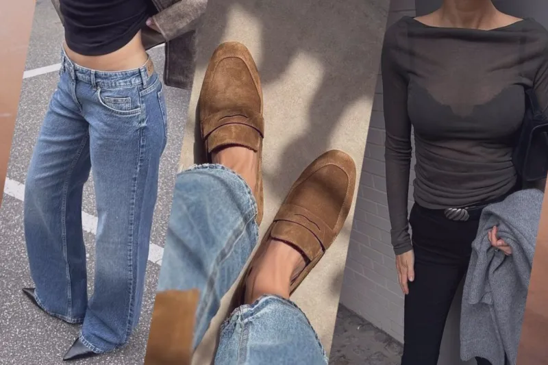 П'ять модних речей весни 2026: шкіряна куртка, напівпрозорий лонгслів, лофери, джинси з низькою посадкою та акцентна сумка.